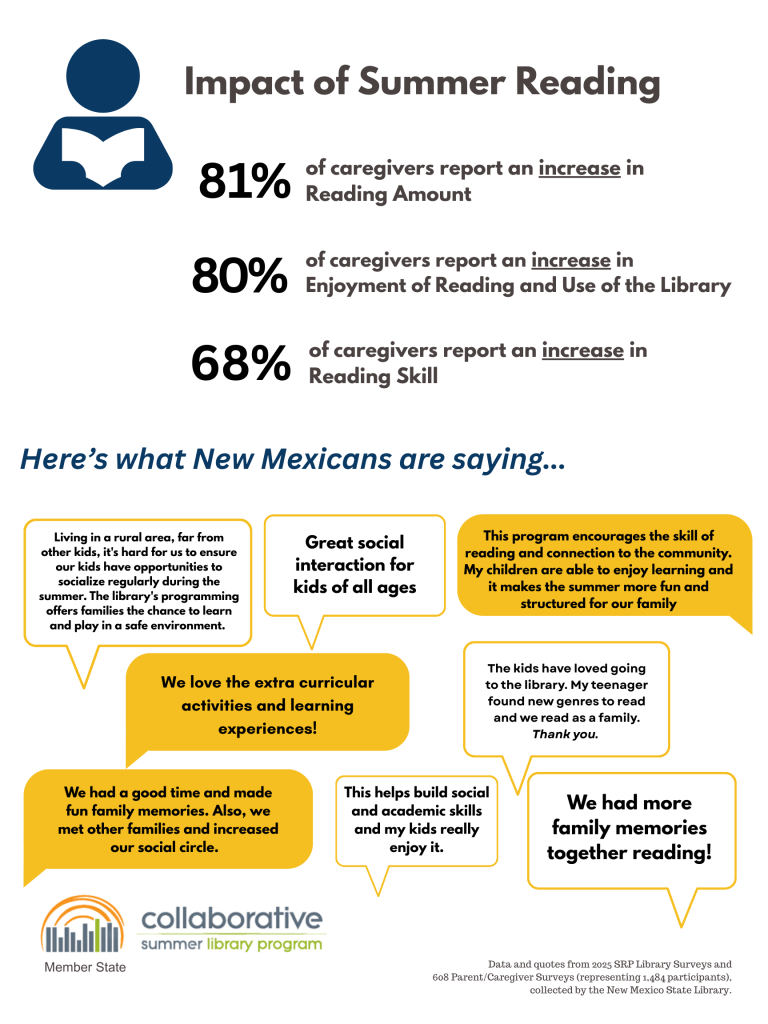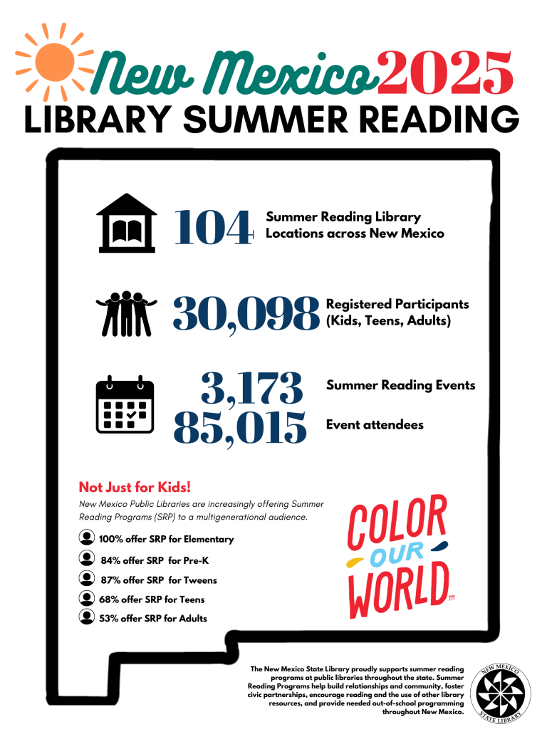 The New Mexico State Library proudly supports summer reading programs at public libraries throughout the state. Summer Reading Programs help build relationships and community, foster civic partnerships, encourage reading and the use of other library resources, and provide needed out-of-school programming throughout New Mexico.